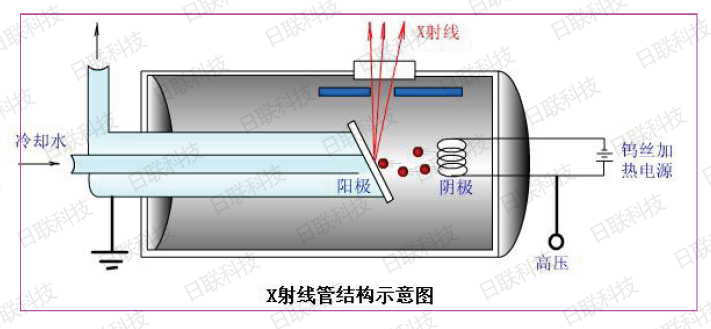 ng28.com在阴极灯丝上安装加热电源后产生活跃电子,然后在阴阳极之间加入压差,吸引电子高速撞击阳极后发生能量转换,电子运动受阻后失去动能,其中绝大部分(99%左右)能量转变成热能使物体温度升高,仅仅小部分(约1%)能量则转化为有效X射线,如下图X射线管结构示意图: