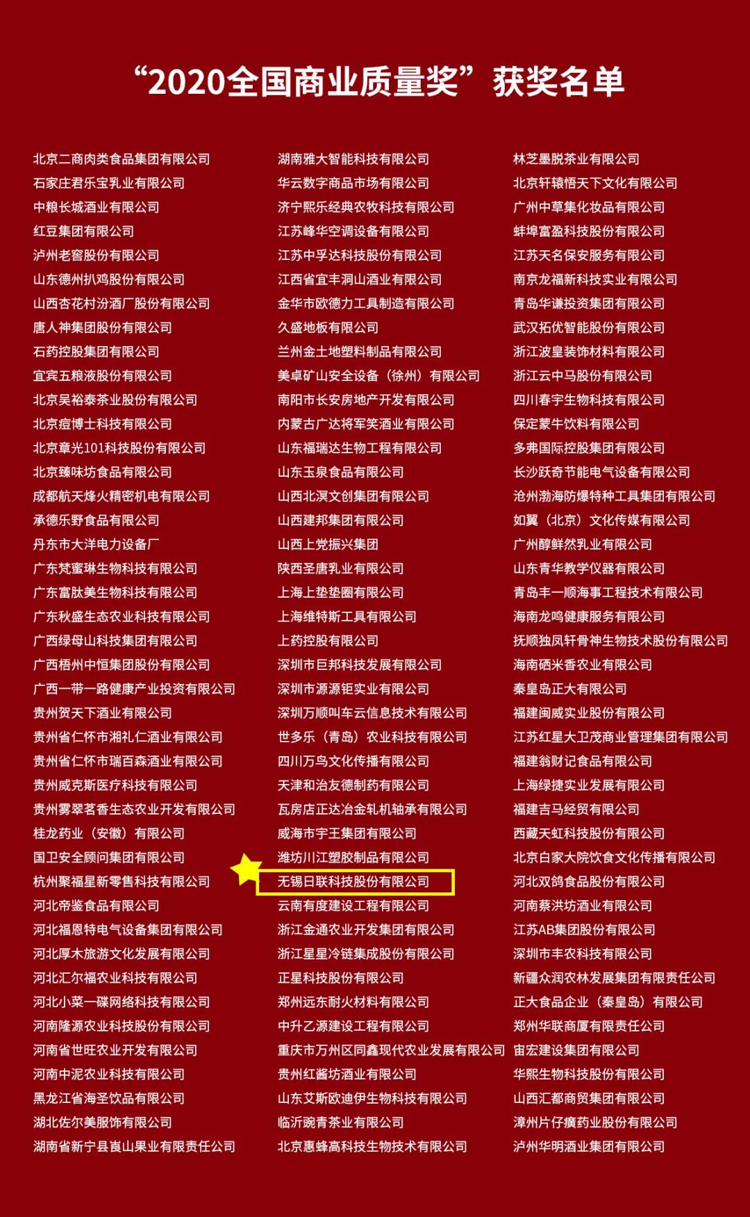 根据《全国商业质量奖评审管理办法》(试行)有关规定,经企业自愿申报、各地商业主管部门和行业协会推荐,全国商业质量奖评审办公室初步形式审查,并依据国家标准《卓越绩效评价准则》(GB/Z19580—2012)和《卓越绩效评价准则实施指南》(GB/Z19579—2012)技术文件,组织专家评审及获奖名单公示,决定授予无锡ng28.com科技股份有限公司等126家单位“2020年全国商业质量奖”。