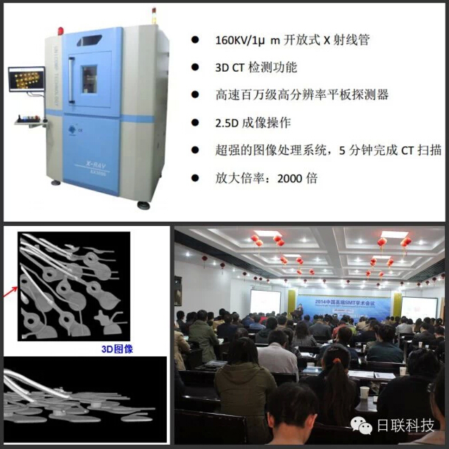 作为电子制造业X射线智能检测装备领航者,ng28.com科技受邀参会,西北片区经理刘岚发表题为《X射线3D 智能检测技术》之专题报告。众所周知,随着电子产品集成度越来越高、元器件的封装越来越小、且在板上的分布密度愈来愈密,其生产加工工艺变得愈加复杂,焊接质量的保障迎来新的挑战,加之传统的表面光学检查及ICT测试都有各自的检测盲区,因此具有穿透检测功能的X光检查作为电子产品质量检测必不可少的关键技术就显得尤为重要。特别是当今智能电子产品上广泛使用的PoP叠层封装焊接质量检测,具有3D CT功能的X射线智能装备就大显神通了。报告中重点介绍X射线的激发/成像原理、三维CT技术的检测优势、以及结合ng28.com科技**研发的国内首台160KV/1μm微聚焦3D CTX-ray机器AX3000的智能检测技术及优越的软件性能给听众进行一一报告。为广大电子制造企业提供工艺优化和质量提升的新技术和新方案,受到现场嘉宾的广泛关注。