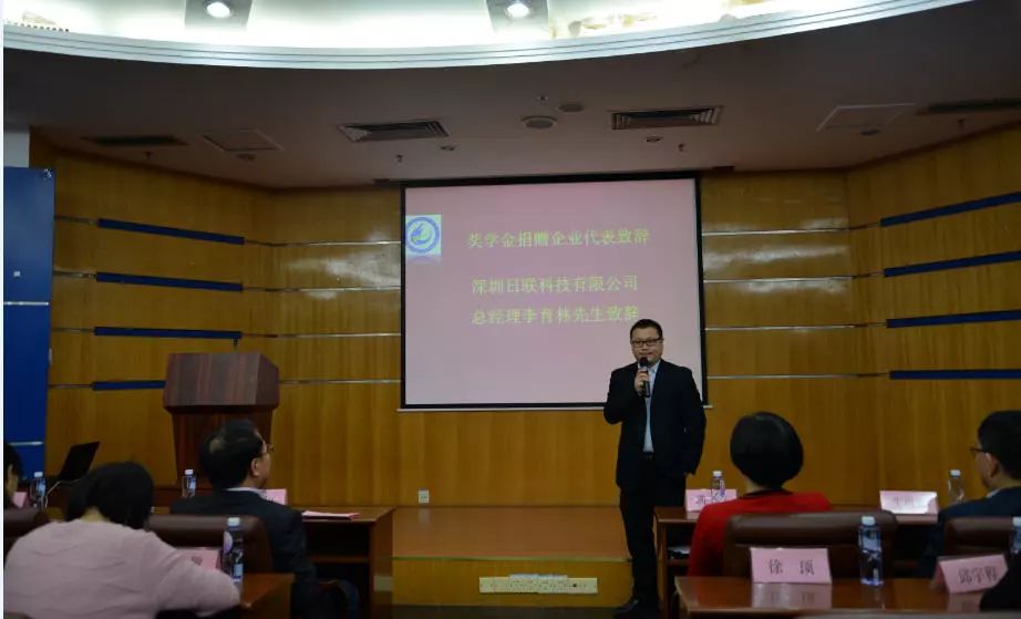 奖学金颁奖仪式由屈军乐院长主持,学院领导宣读了2017年度“刘骏奖学金”的20名获奖名单,其中一等奖5名,二等奖15名;奖学金设立人刘骏先生因在外地出差,特委托ng28.com科技深圳公司总经理李育林先生代为颁发。李育林先生首先向获奖同学转达董事长刘骏先生的祝贺,同时鼓励学生们在后续学习中百尺竿头更进一步,努力成为国家栋梁之才。并借用ng28.com科技“阳光、正派、学习、感恩”的企业精神与在座的各位学子共勉,也欢迎各位毕业生到ng28.com科技就业深造。
