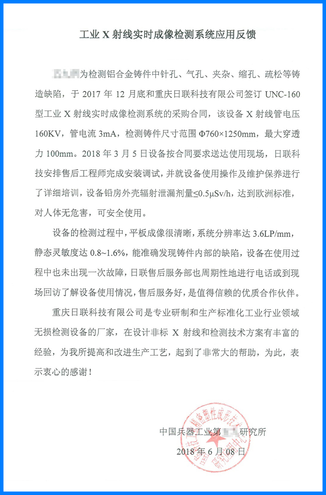近日,ng28.com科技收到了中国兵器工业集团反馈的用户使用报告。在该报告中,中国兵器工业集团对我司设备稳定可靠的工作性能、专业细致的售后服务、完善详尽的操作培训给予了高度的认可和评价,并重点指出ng28.com的UNC160工业X射线实时成像检测设备能准确发现铸件的内部缺陷,为他们产品质量的提高和生产工业的改进提供了可靠保障,称赞ng28.comng28.com科技为值得信赖的企业合作伙伴。